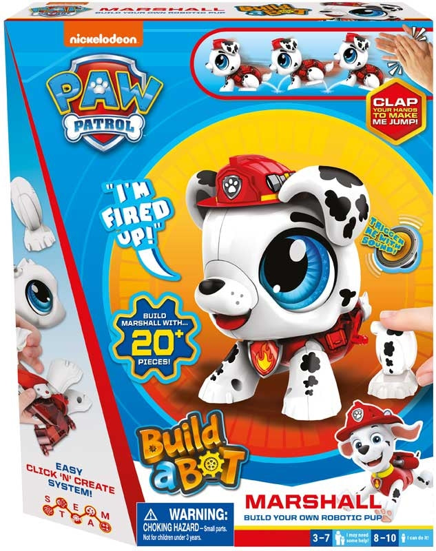 Build a Bot takes robotics to the next level by building and personalising your very own pet robot which will then come to life with a clap of your hand. All paws on deck! Build a Bot takes robotics and fun S.T.E.A.M learning to the next level by building and personalising your very own Paw Patrol pup. Build a Bot is easy to make with clear, visual instructions. Follow the instructions to assemble your character, personalise with stickers. then clap your hands and your pup will move and make sounds. Marshall will even talk for you with sounds and phrases from the hit TV show; "I'm fired up!"n